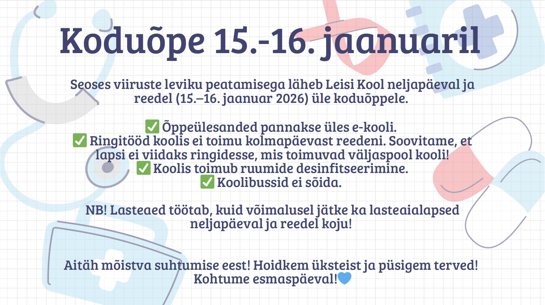 Seoses viiruste leviku peatamisega läheb Leisi Kool neljapäeval ja reedel (15.–16. jaanuar 2026) üle koduõppele.