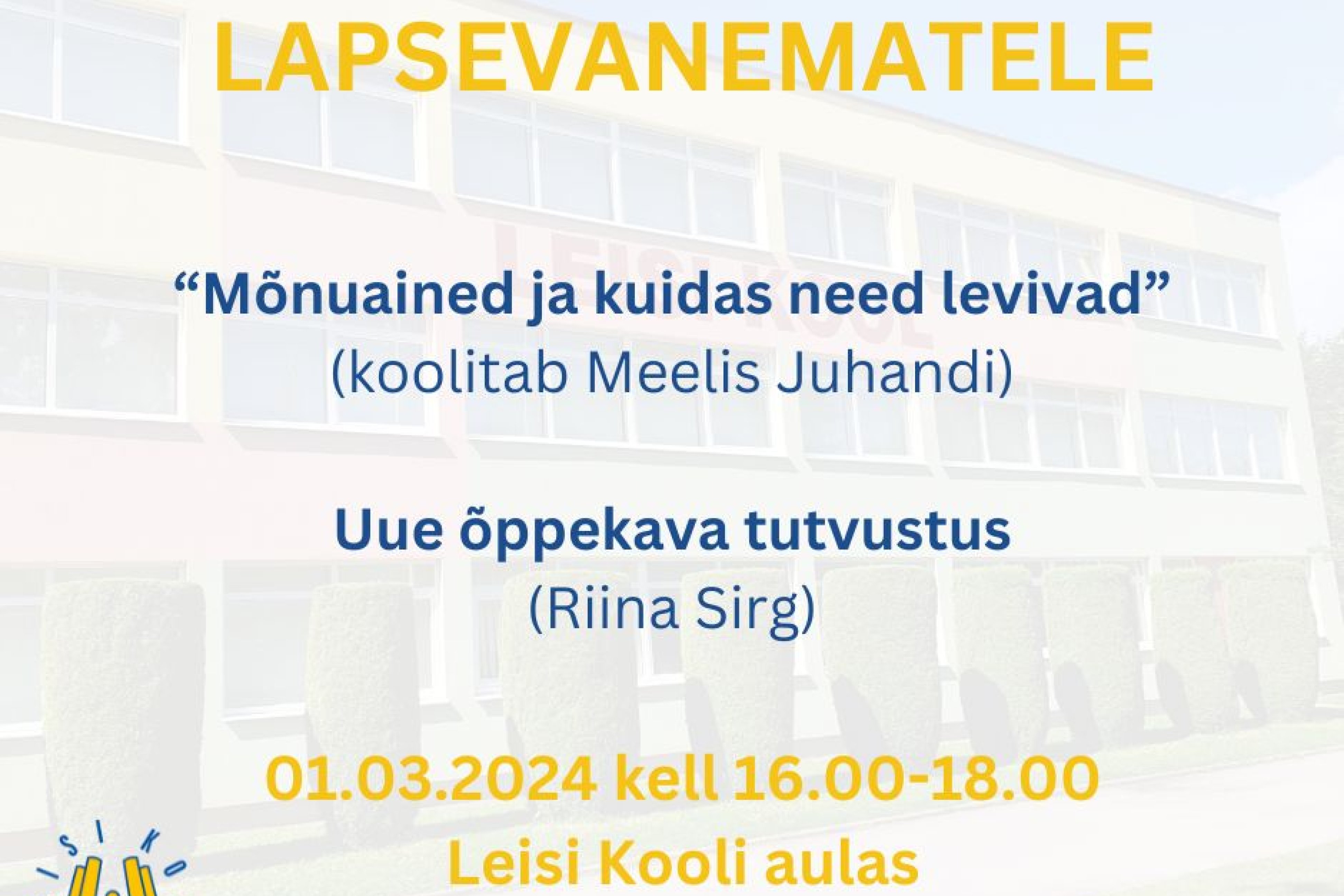 Kutsume Leisi Kooli lapsevanemaid osalema 1. märtsil toimuvale kokkusaamisele, kus toimub:
