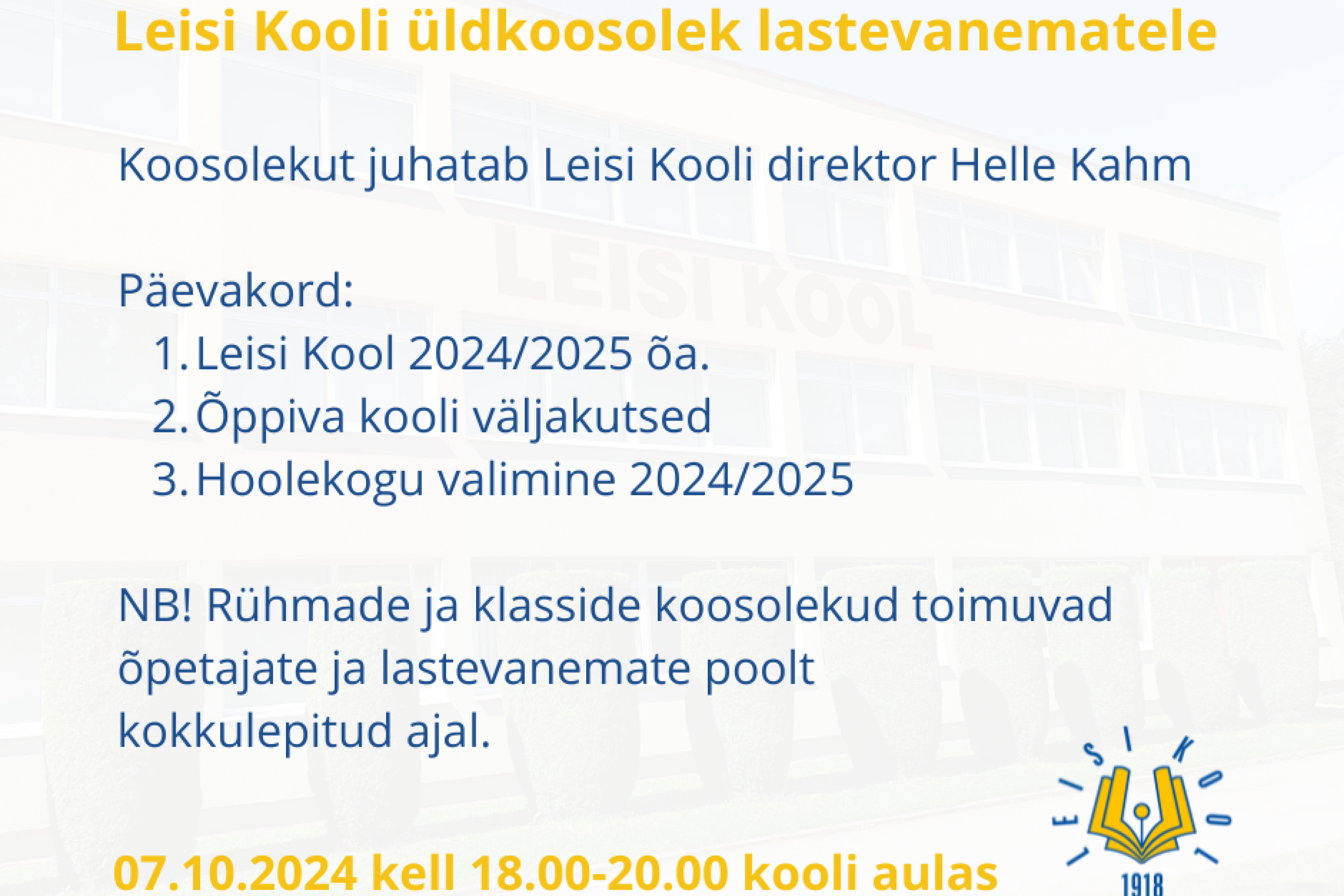07.10.2024 kell 18.00-20.00 Leisi Kooli aulas