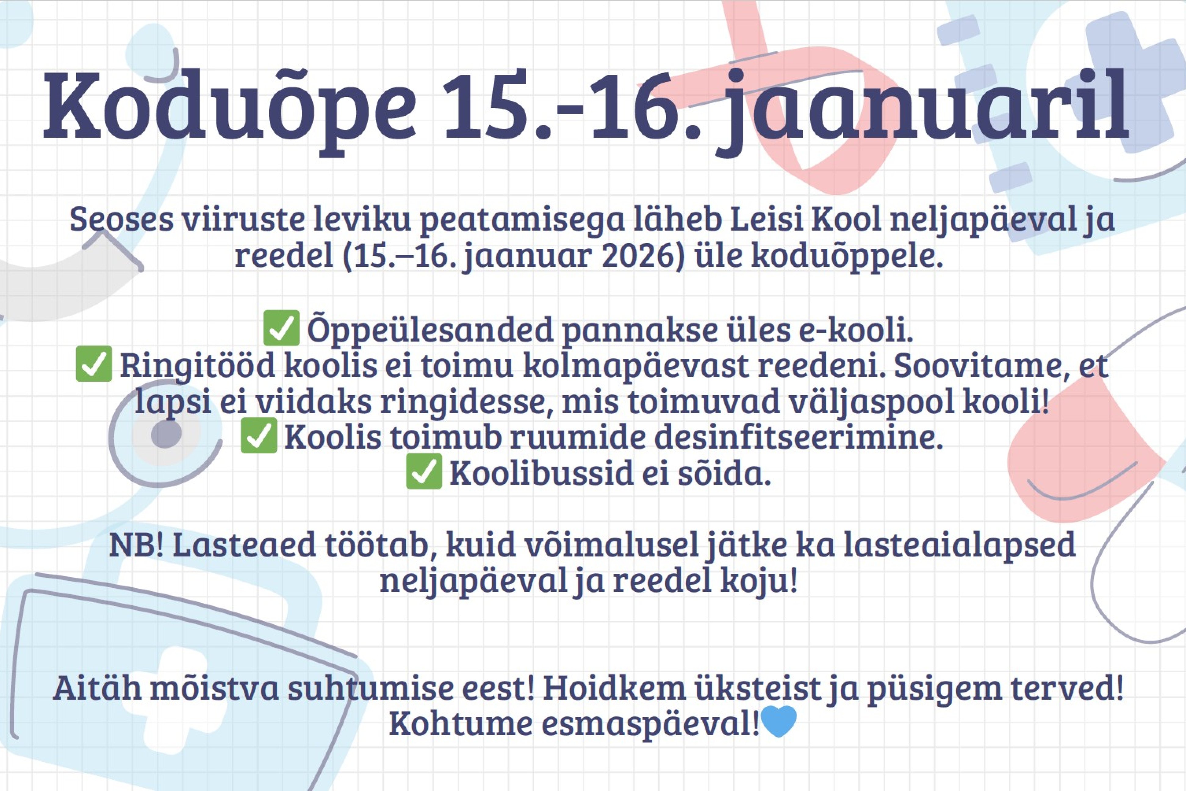 Seoses viiruste leviku peatamisega läheb Leisi Kool neljapäeval ja reedel (15.–16. jaanuar 2026) üle koduõppele.